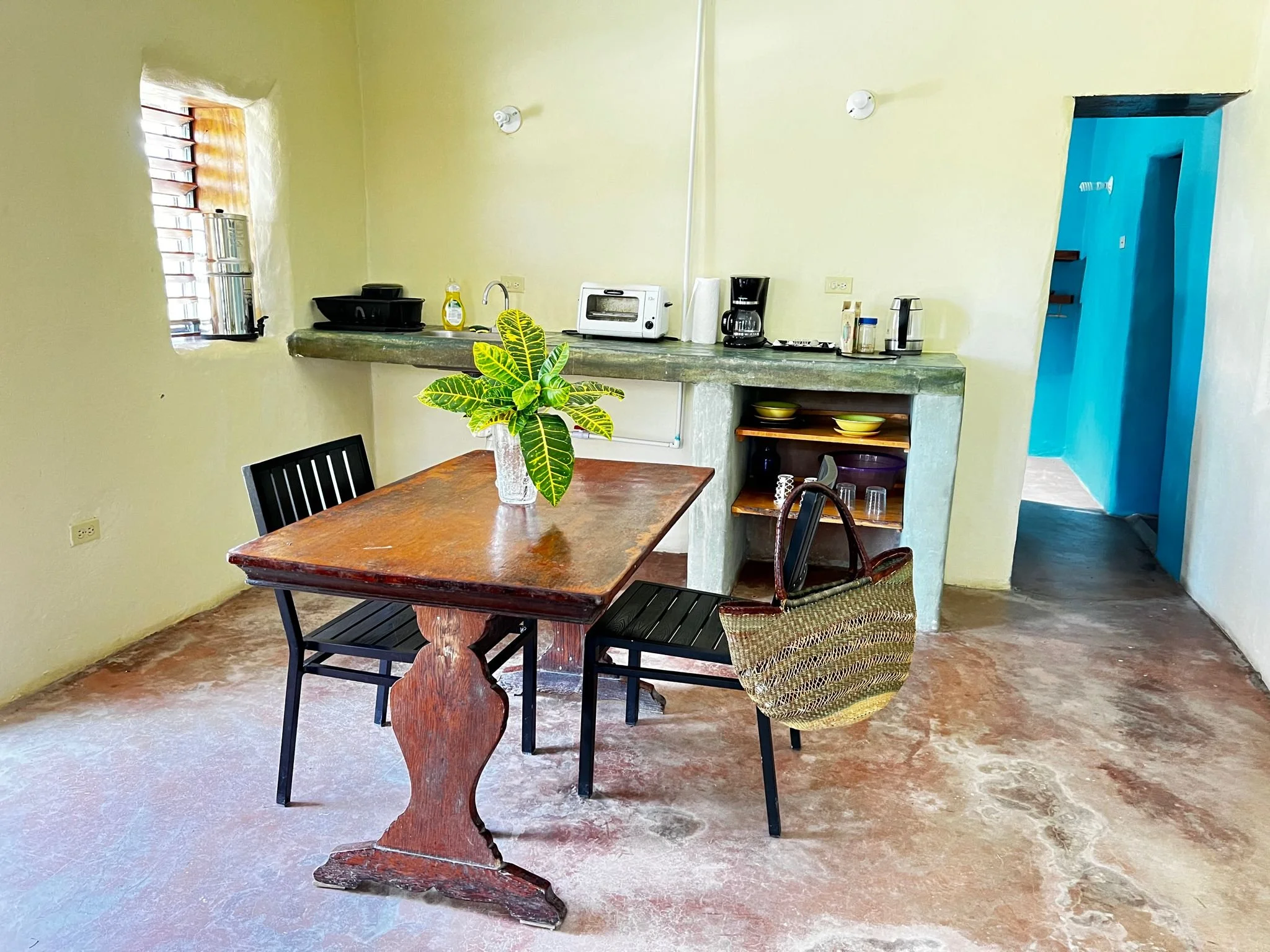 Meet the charming adobe cottage, Earthbag. This sweet one-bedroom getaway features two Earthbag built-in sofas for additional sleeping. There’s a rustic, hobbit vibe in this complete mini-house. Minimalist and clean with the womb-like comfort of its sturdy, rough hewn walls, and concrete kitchen counter, this unit is on grid with eco-rated refrigerator, and outdoor patio. There is roof access for stargazing or enjoyment of the splendid ocean and mountain views. The Source’s Passionfruit dining room is a 2-minute, nature walk away.